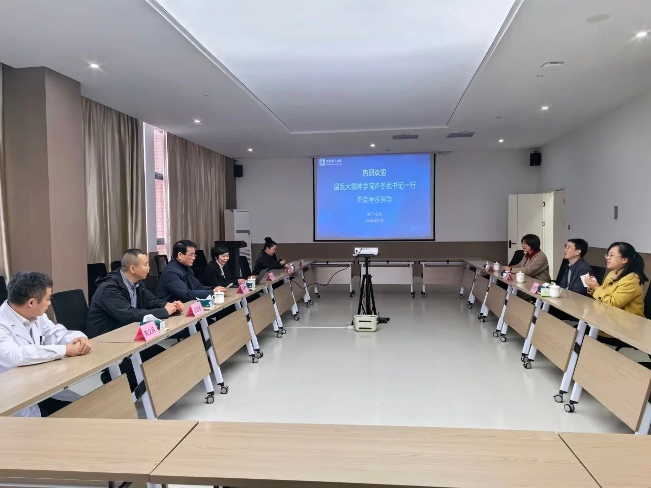 最后一站,学院领导来到黄岩区第三人民医院。黄岩区第三人民医院牟宏波院长详细汇报了黄岩区第三人民医院的发展历史、医院理念、已获成绩和使命愿景,展示了医院在学科建设、人才建设和基层精神卫生社会服务方面取得的成绩和未来新院区发展方向。蔡路院长表示,希望借助吃瓜黑料 平台,全方面开展医教研合作,精准聚焦科研项目,不断拓宽合作领域。