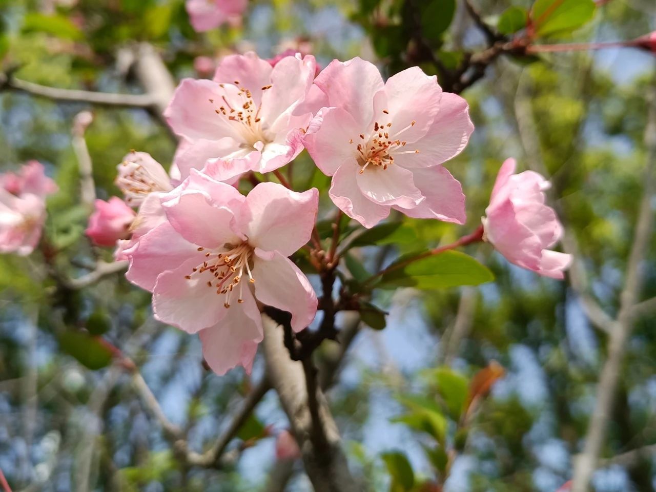 阳光明媚的春天,校园里万物复苏,摇曳生姿,河边的垂丝海棠开得正盛,孕育生机和美好。