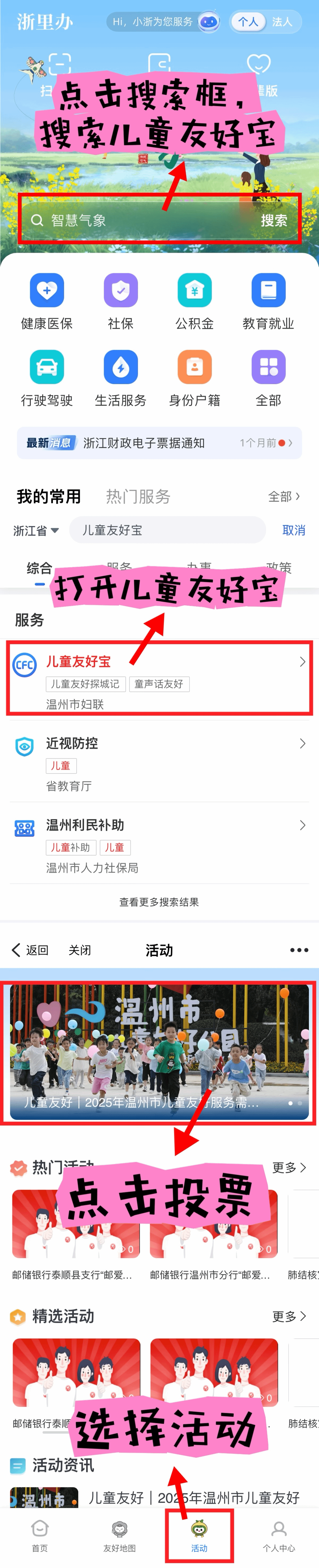 为营造儿童发展的良好环境,倡导儿童优先的理念,深入推进温州儿童友好城市建设工作,温州市政府妇女儿童工作委员会办公室、温州市妇联面向广大儿童和家庭,启动2025年儿童友好服务需求征集,请选择你心仪的服务需求,帮助我们后续提供更精准、更贴心的服务! 即日起至3月25日, 每个ID需选足 10项心仪的儿童友好服务需求。 (按项目名称拼音排序) 1.“爱护我们的身体”自我保护课程 2.儿童美好品格课程 3.轨道童行 让城市更精彩 4.“光影留声 筑梦同行”亲子电影鉴赏 5.“健康小主人”特色场馆实践 6.“妈妈的味道”食育课程 7.“瓯越魅力 童心传承”非遗传承体验 8.“趣·玩万花筒”科学小课堂 9.市图书馆“小小管理员”职业体验 10.少年急救官项目 11.“挺起少年脊梁”育英脊梁工程 12.特色场馆体验(家风馆、数学名人馆、工匠馆等) 13.“童行蓝天”少年航校公益课 14.“幸福e家”家庭教育课程 15.“小小规划师”职业体验 16.“小小眼科医生”明眸守护行动 17.“小小牙医”研学体验活动 18.“心之屿”亲子关系辅导 19.“温心守护”儿童心理健康关爱行动 20.“营”动未来 体重管理行动 打开“浙里办”APP,搜索点击“儿童友好宝”应用,选择底栏活动版块,从中选择“儿童友好|2025年温州市儿童友好服务需求征集!”,为您最心仪的10项心仪的儿童友好服务需求投票!