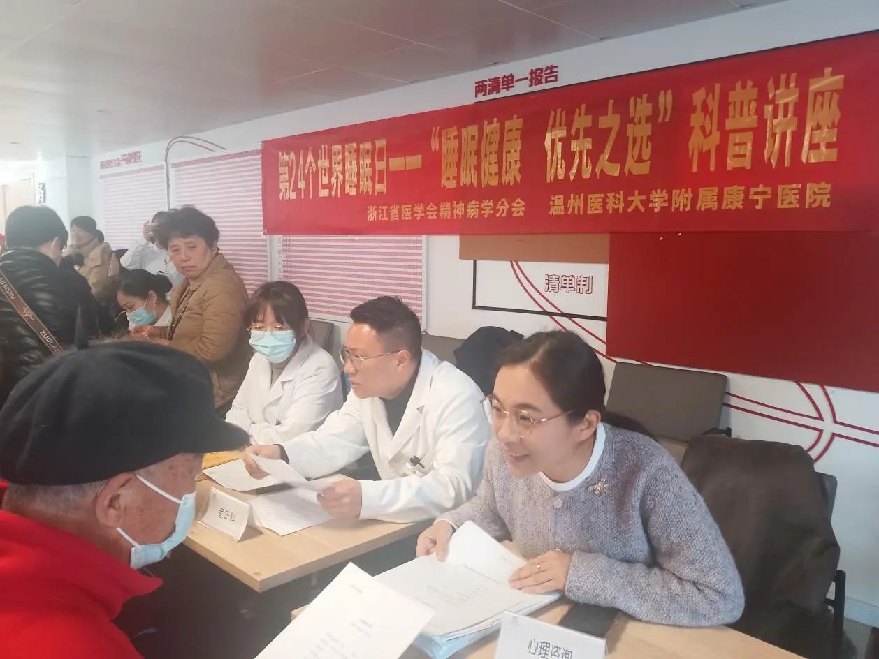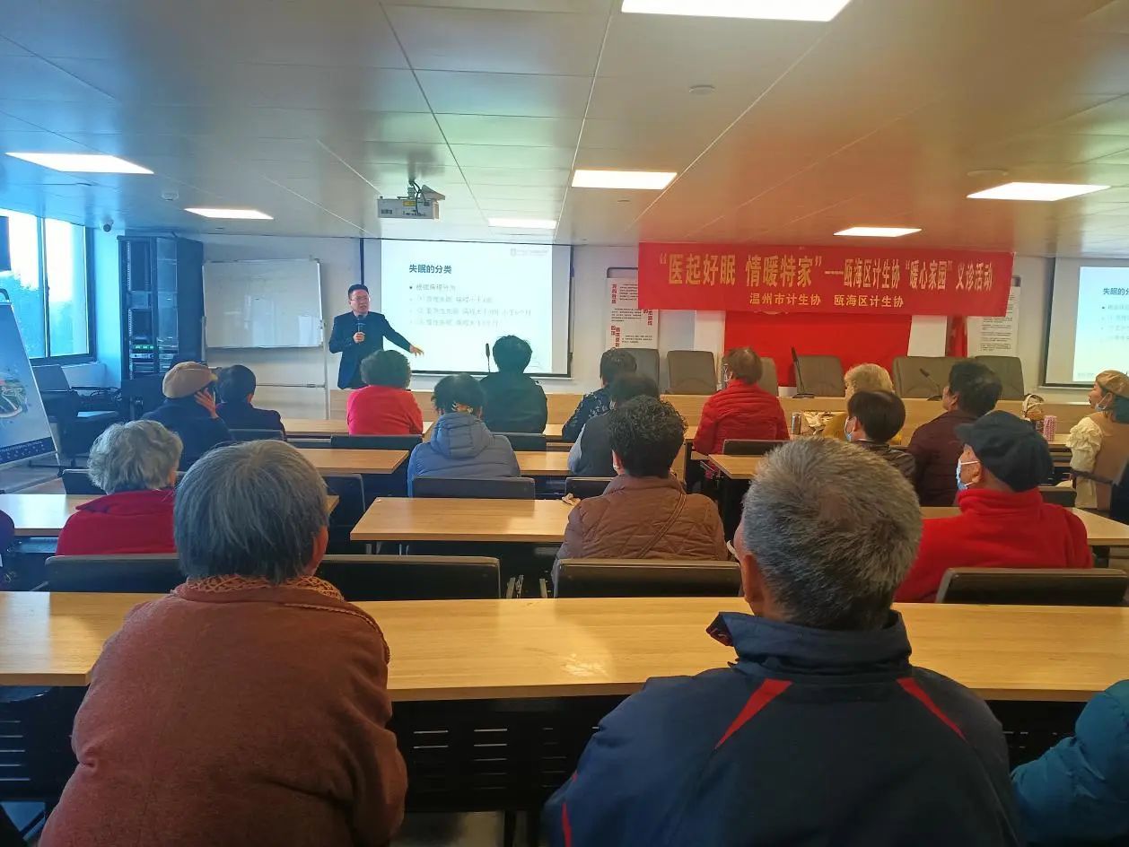 World Sleep Day 世界睡眠日 在 3月21日以 “健康睡眠,优先之选” 为主题的世界睡眠日,我院教工第二党支部与学生团委携手吃瓜黑料 附属康宁医院医生,在瓯海区新桥街道新桥社区举办“医起好眠,情暖特家”活动,为社区老年人送上温暖的健康关怀,以实际行动践行党的宗旨,让党建引领健康服务深入基层。 党建引领,共筑健康防线 活动开始,社区代表发表开场致辞,向在场的老年人介绍活动目的与流程,强调睡眠健康对晚年生活品质的重要性,为活动拉开序幕。随后,附属康宁医院陈孙克医生深入浅出地讲解老年人睡眠主题讲座,剖析睡眠障碍的类型、成因、危害及改善方法,结合实际案例,让老人们正确认识睡眠问题。同时,擅长老年专科与精神科的医生团队为老人测血压、血糖,解答健康疑问,提供个性化睡眠建议,涵盖饮食、运动、心理调节等多方面,以专业力量为老人健康护航。