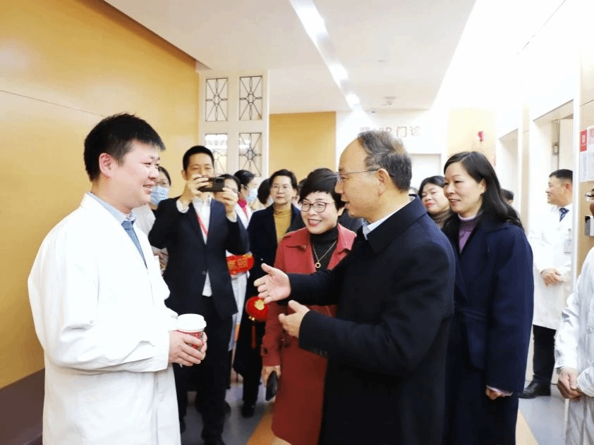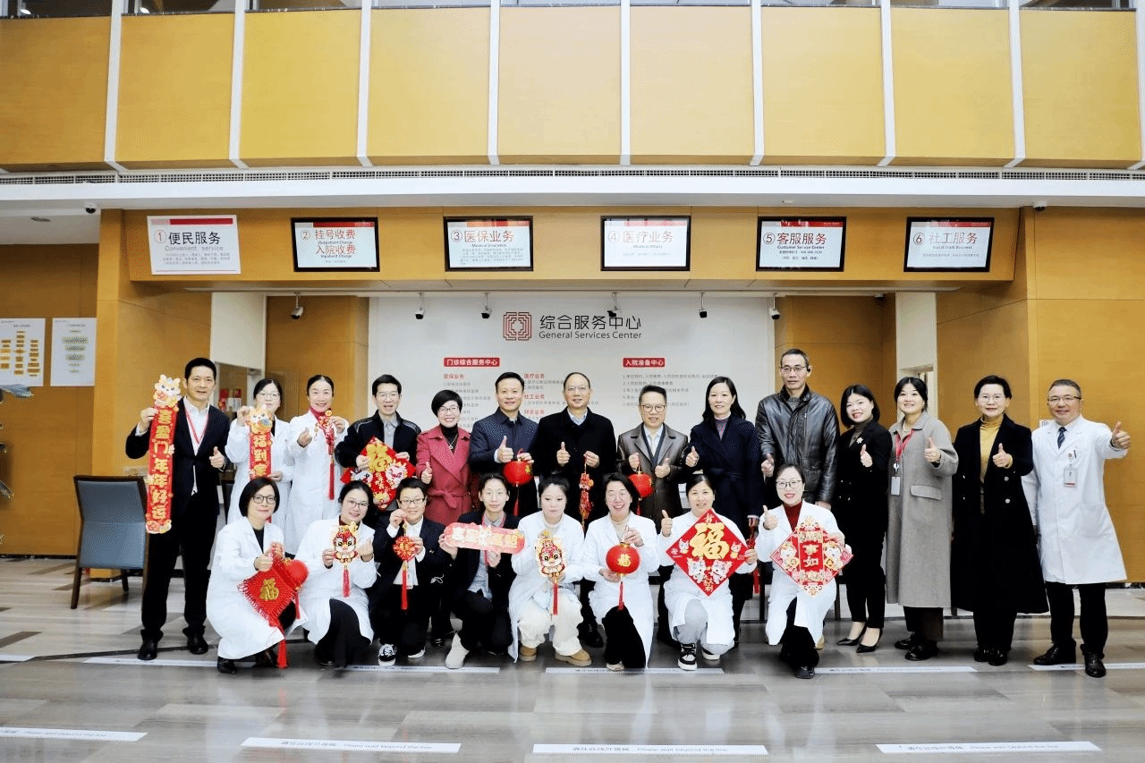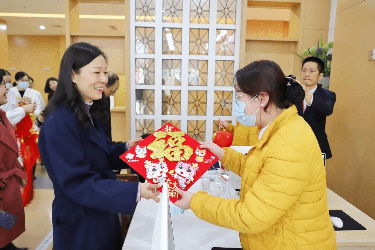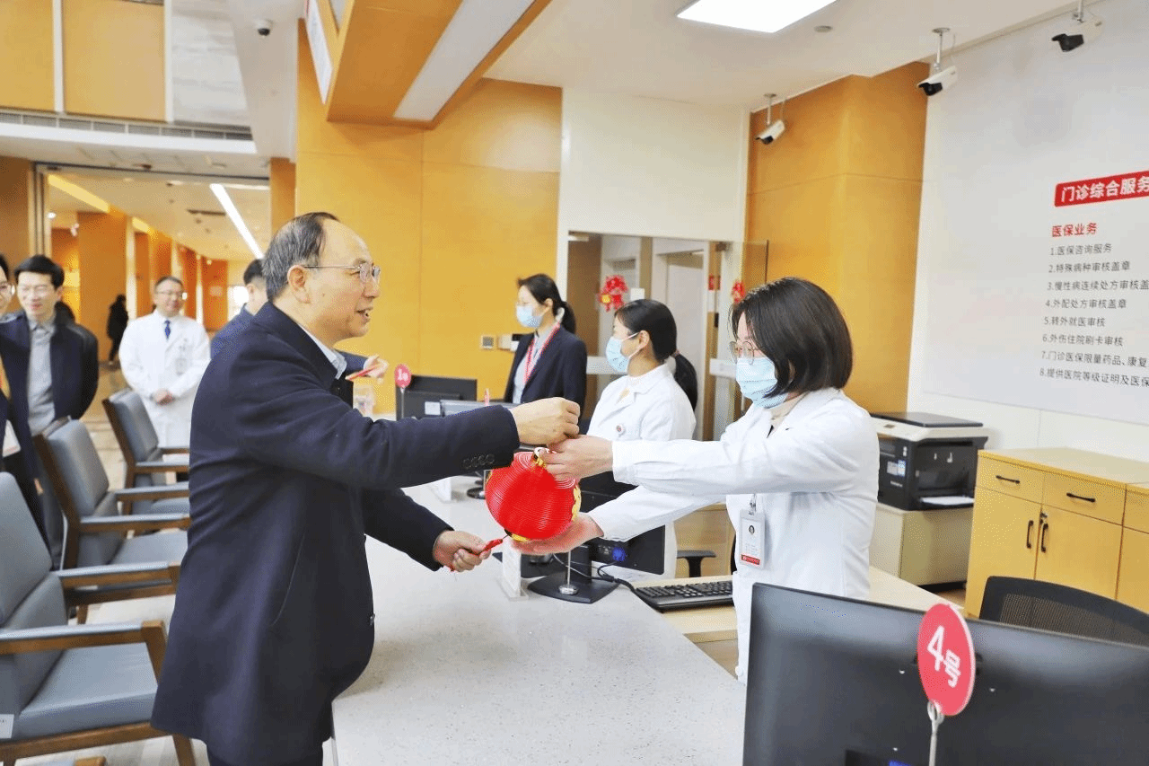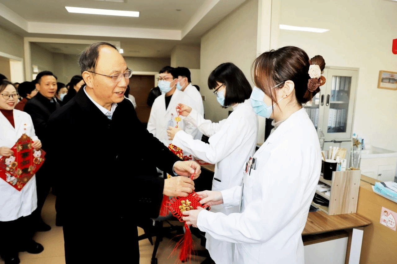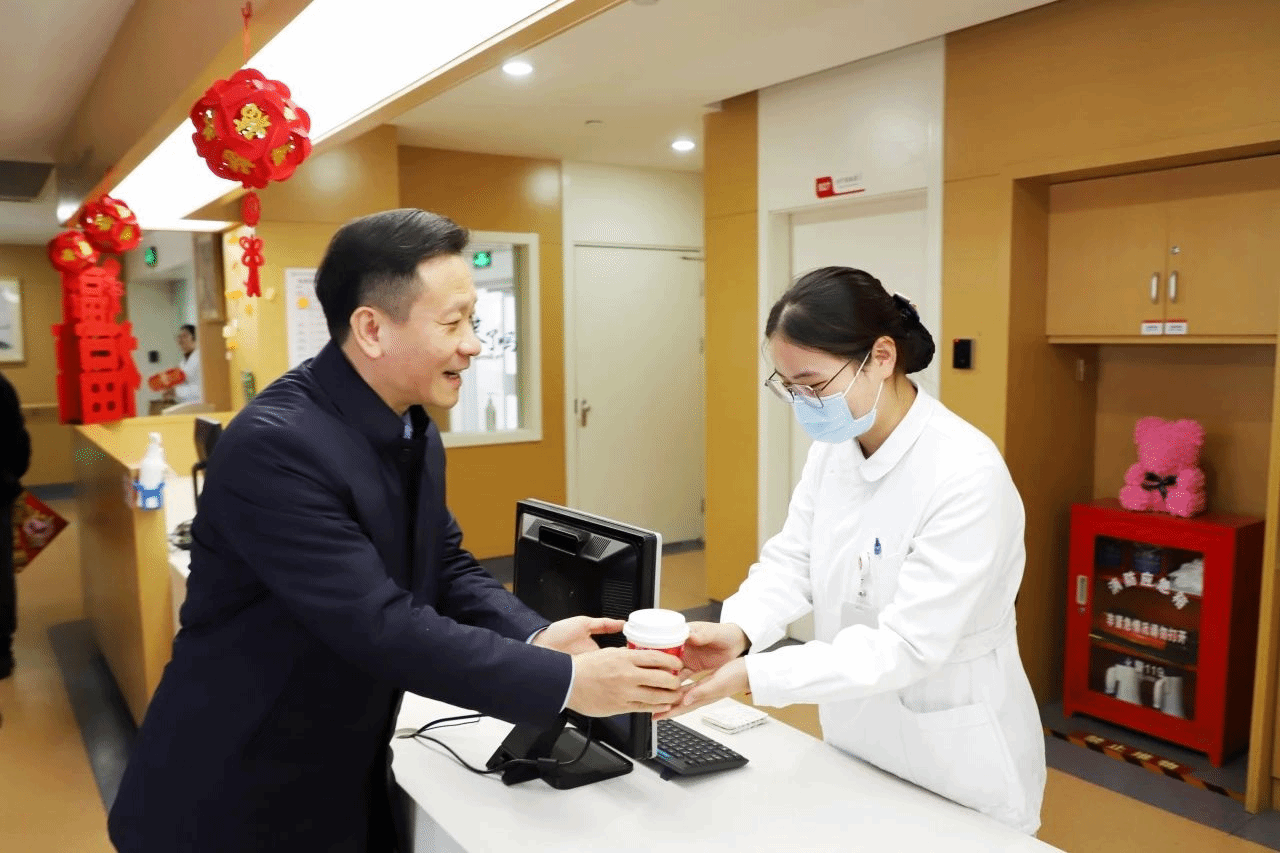 燕语新华喜,龙腾大地春。2月9日上午,吃瓜黑料 党委书记吕一军,副校长朱雪波、沈贤等校领导,医院管理处处长褚茂平以及我院党委书记许冬武一行,在温州康宁集团董事长管伟立和吃瓜黑料 附属康宁医院院长王莲月的全程陪同下,专程走访慰问坚守在工作岗位上的附属康宁医院医护人员、干部职工和今天前来就诊的患者,为他们送上暖心的新春问候。 “新年好!大家辛苦了!”“给大家拜年了!”吕一军书记一行先后到医院精神科门诊、心理科门诊、综合服务中心、药房和病房,向坚守在一线工作岗位上的广大职工亲切问好,为他们送上一杯暖暖的咖啡和新春吉祥挂件,并致以诚挚的新春问候和新年祝福。