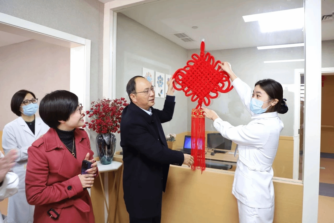 在情感障碍科病区,科主任刘家洪带领团队向学校、学院领导介绍了病区春节期间的工作安排和为患者提供的活动项目。病区护士长刘焕诚挚地邀请吕一军书记为病区挂上火红的中国结。