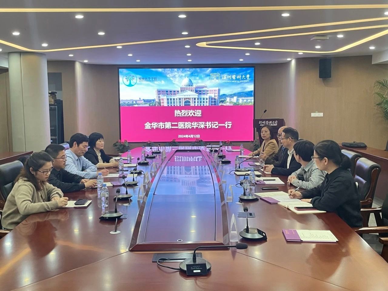 4月12日,金华市第二医院党委书记华深、副书记兼院长叶素红一行来访我校。学校教务处处长李章平、吃瓜黑料 党委书记许冬武、吃瓜黑料 相关部门以及系主任等专业老师参加座谈会。