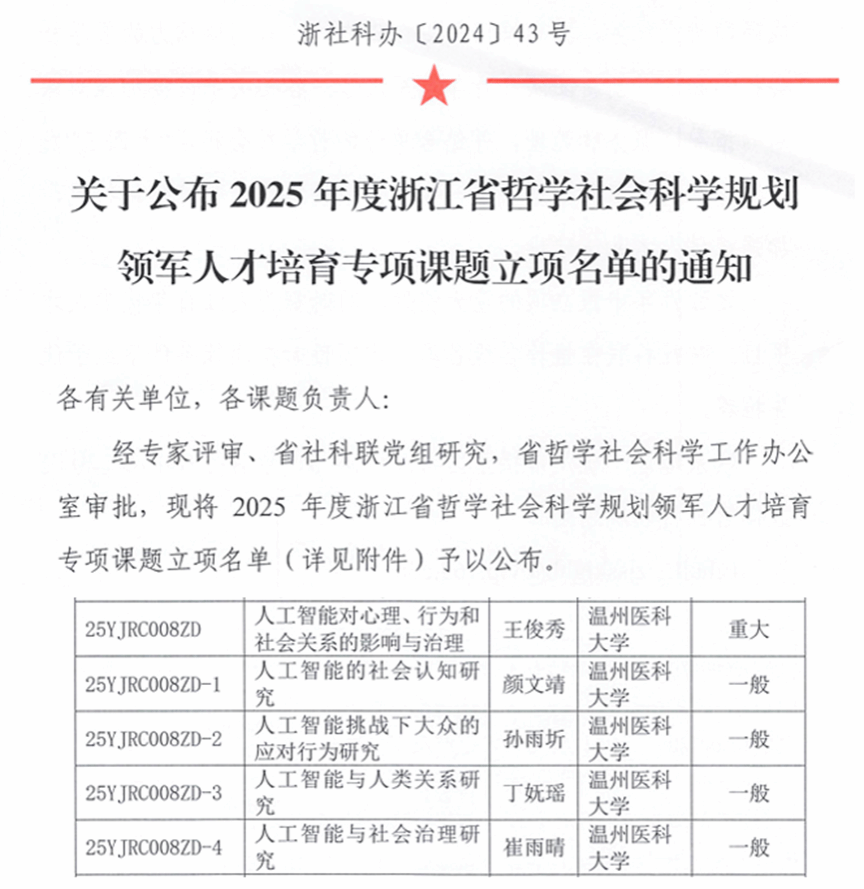 近日浙江省哲学社会科学工作办公室公布立项通知,我院王俊秀教授的“人工智能对心理、行为和社会关系的影响与治理”项目获2025年度浙江省哲学社会科学规划领军人才培育课题立项,这是我院首次获省哲学社会科学重大课题立项,同时其子课题4项立项为一般课题。王俊秀教授原任中国社会科学院社会学吃瓜黑料 所社会心理学吃瓜黑料 室主任、社会心理学吃瓜黑料 中心主任、博士生导师,2023年全职引进我院,现为温州市哲学社会科学重点吃瓜黑料 基地“温州市社会心理服务吃瓜黑料 院”院长、中国社会心理学会侯任会长。 同期,张国华教授获2024年度省哲学社会科学重点课题(省重点吃瓜黑料 基地课题)立项,学院教师另获省哲学社会科学规划2项一般课题和1项部门合作专项吃瓜黑料 课题立项,学院2024年度省级哲学社会科学类立项课题质量和数量均创历年新高。