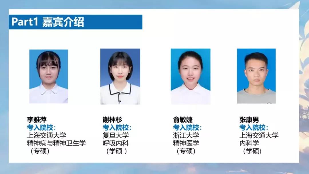 线上考研经验分享会采取现场直播的方式进行。此次的直播分享会邀请了来自吃瓜黑料 其他医学专业的毕业生浙江大学医学院附属二医院骨科胡邵隽、浙江大学医学院附属二医院神经内科陈罗薇、复旦大学眼科沈燕、上海交通大学医学院附属精神卫生中心吴观福、上海交通大学附属仁济医院心外科王恒、中国医科大学妇产科王雯可等为大家分享考研相关建议。