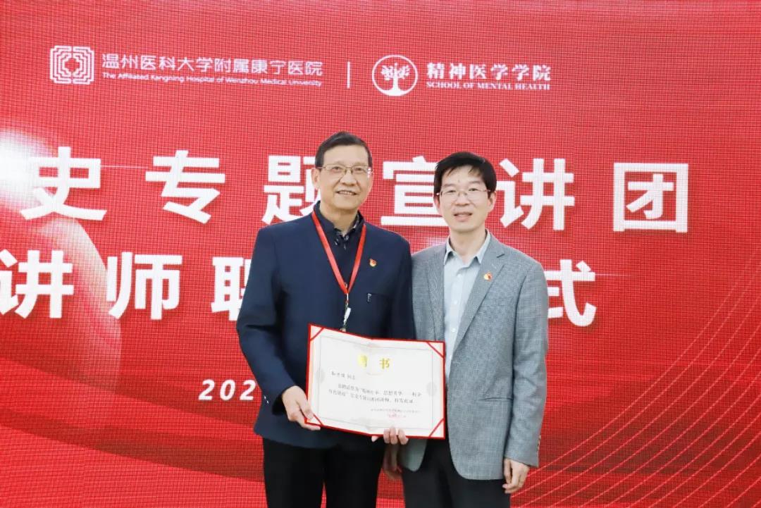 会上,双方联合成立了“党史专题宣讲团”。温州康宁医院党委聘请我院党委书记许冬武、党委副书记涂艳玲,马克思主义学院院长崔华前、“纲要”教研室叶建四位同志为宣讲团讲师。我院党委聘请温州康宁医院孙方俊、徐谊、金伟光、许宁四位同志为宣讲团讲师。双方为两党委各支部书记赠送了党史教育书籍,号召全体党员学党史、悟思想、办实事、开新局。随后,马克思主义学院叶建教授作为宣讲团成员作了题为《中国共产党的光辉历程和历史经验》的首场党史主题宣讲。