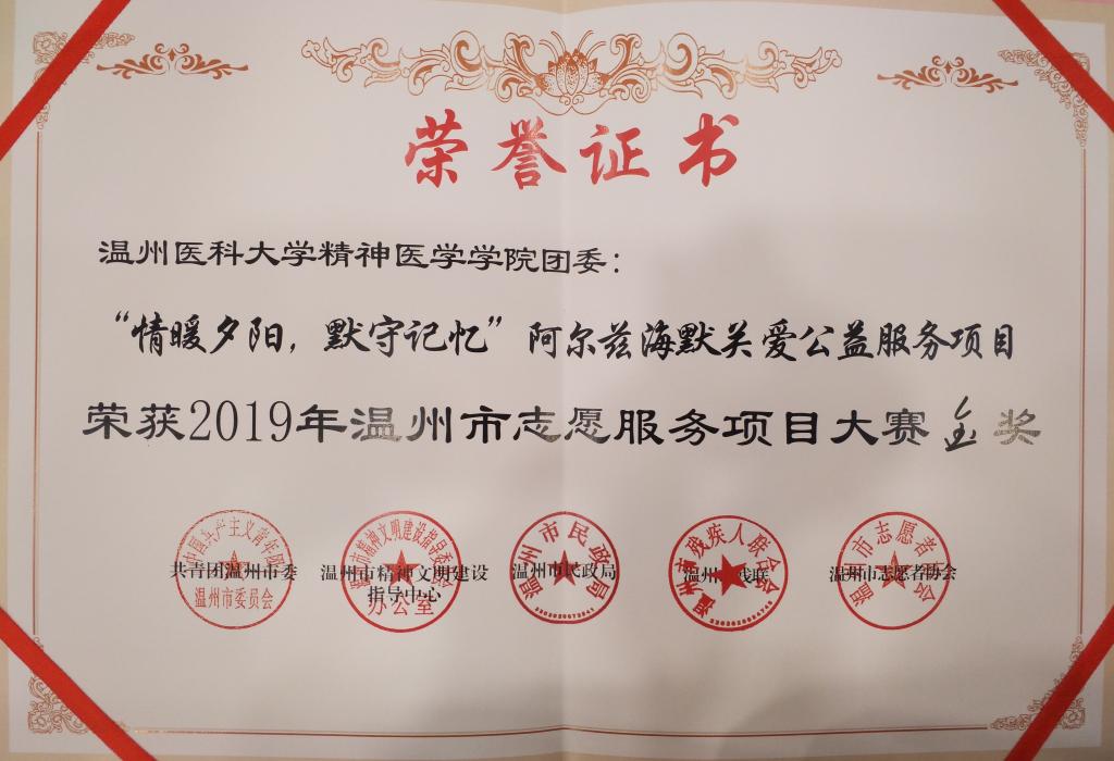 “情暖夕阳,默守记忆”阿尔兹海默关爱公益服务项目以关爱老年群体精神健康为目标,重在阿尔茨海默症的预防宣传,通过普查初筛、记忆关爱、益智游戏、手指操、宣传讲解、心理调研等方式,锻炼老年人的记忆能力,帮助老年人减缓记忆衰退。项目得到北京大学第六医院、康宁集团温州怡宁老年医院等专业支持。项目开展以来,受益人数达到15000人。本项目后续还将继续参与省级赛事,并获得经费资助、团队孵化、导师帮扶、人才招募、跟踪培育等“一揽子”扶持激励措施。