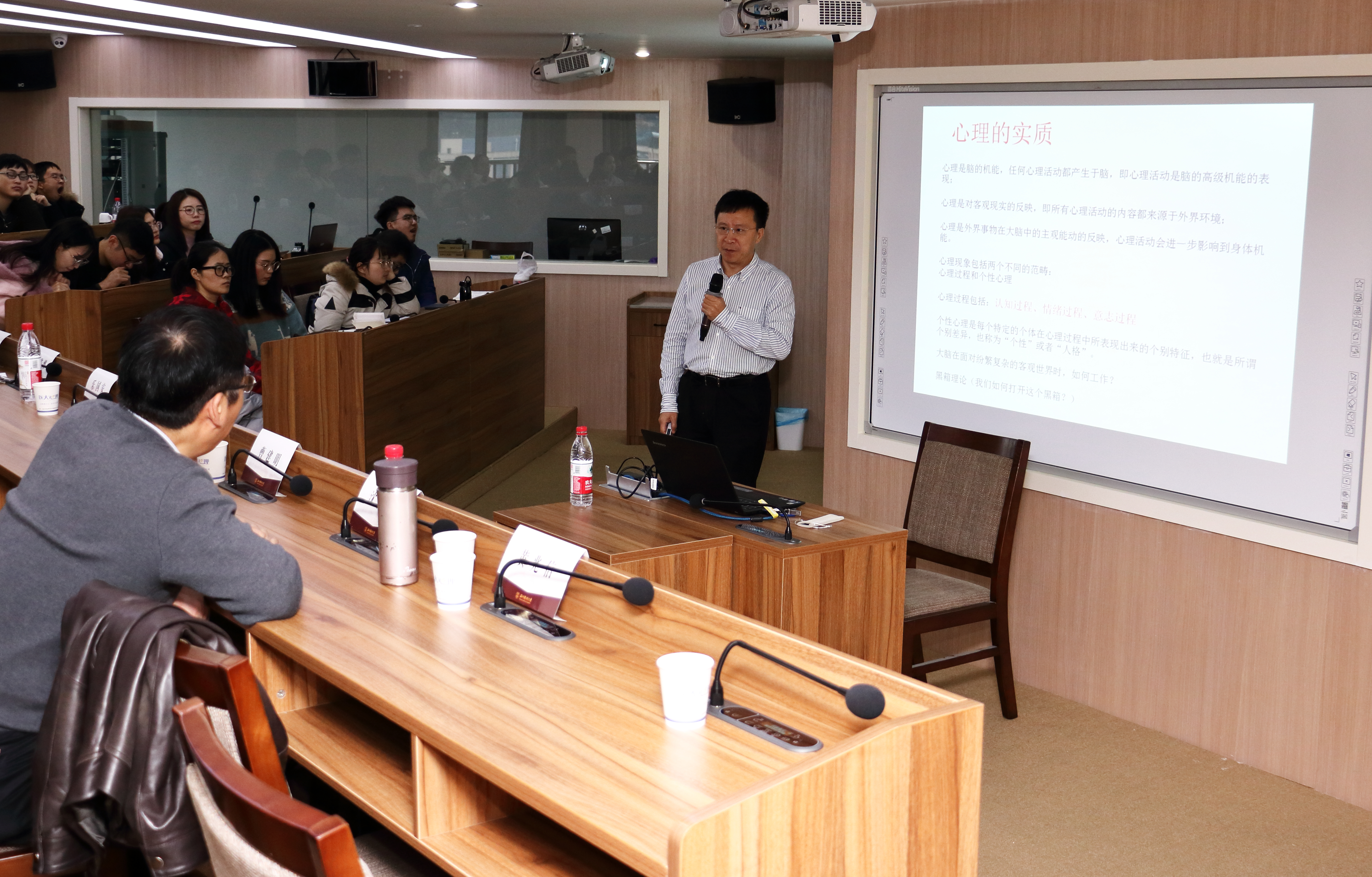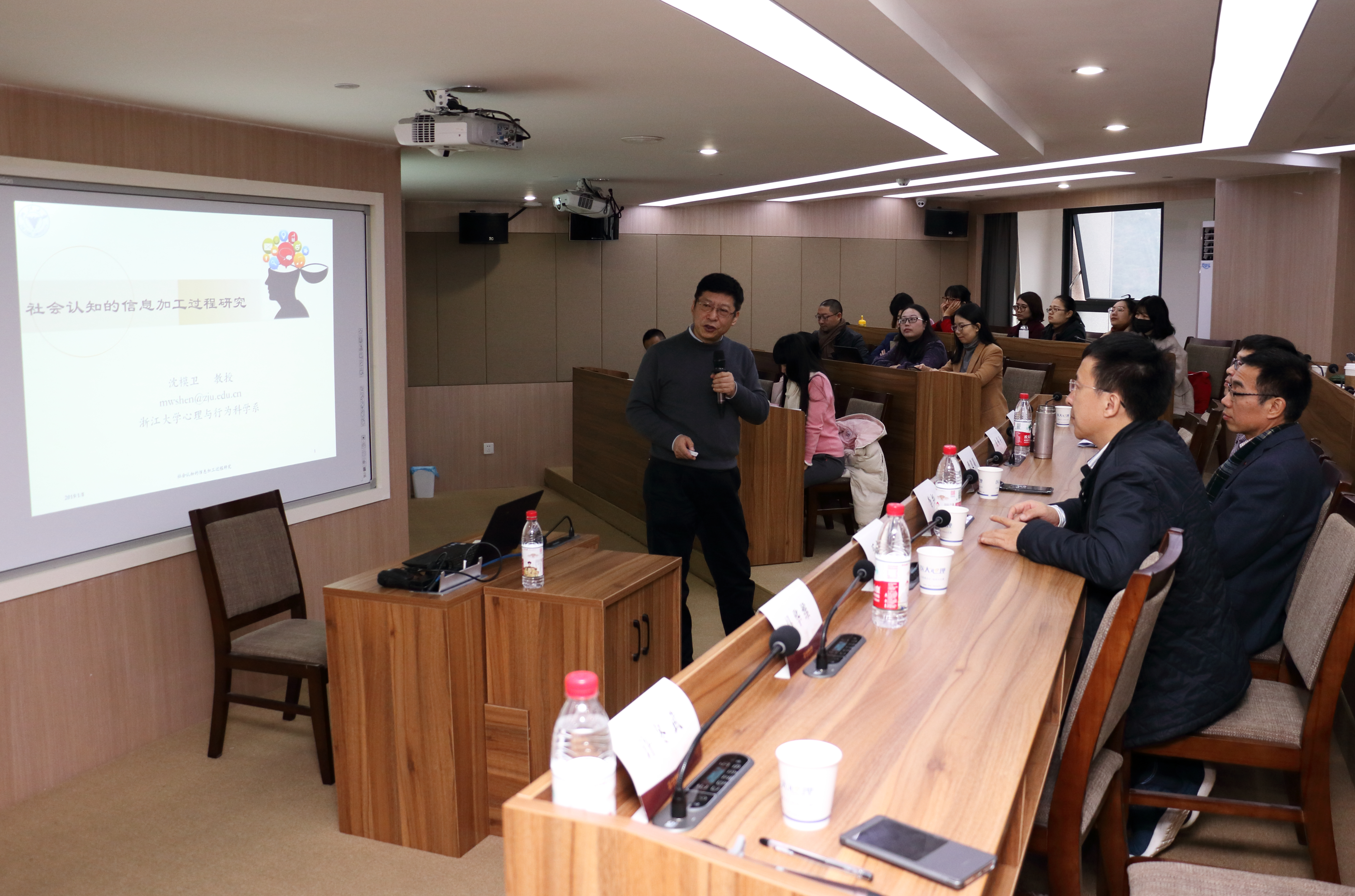 校领导曹建明副校长和社科处黄兆信处长出席会议并致辞。曹校长指出,国家卫健委、中宣部等22个部门于2016年颁布《关于加强心理健康服务的指导意见》,心理学学科和专业迎来快速发展的良好时机。我校心理学在十多年的建设过程中取得了一些进步,但总体发展还比较薄弱,期待三位专家为我们介绍心理学科发展最前沿的知识,同时为我校心理学科和专业的建设发展提出宝贵的意见和建议。